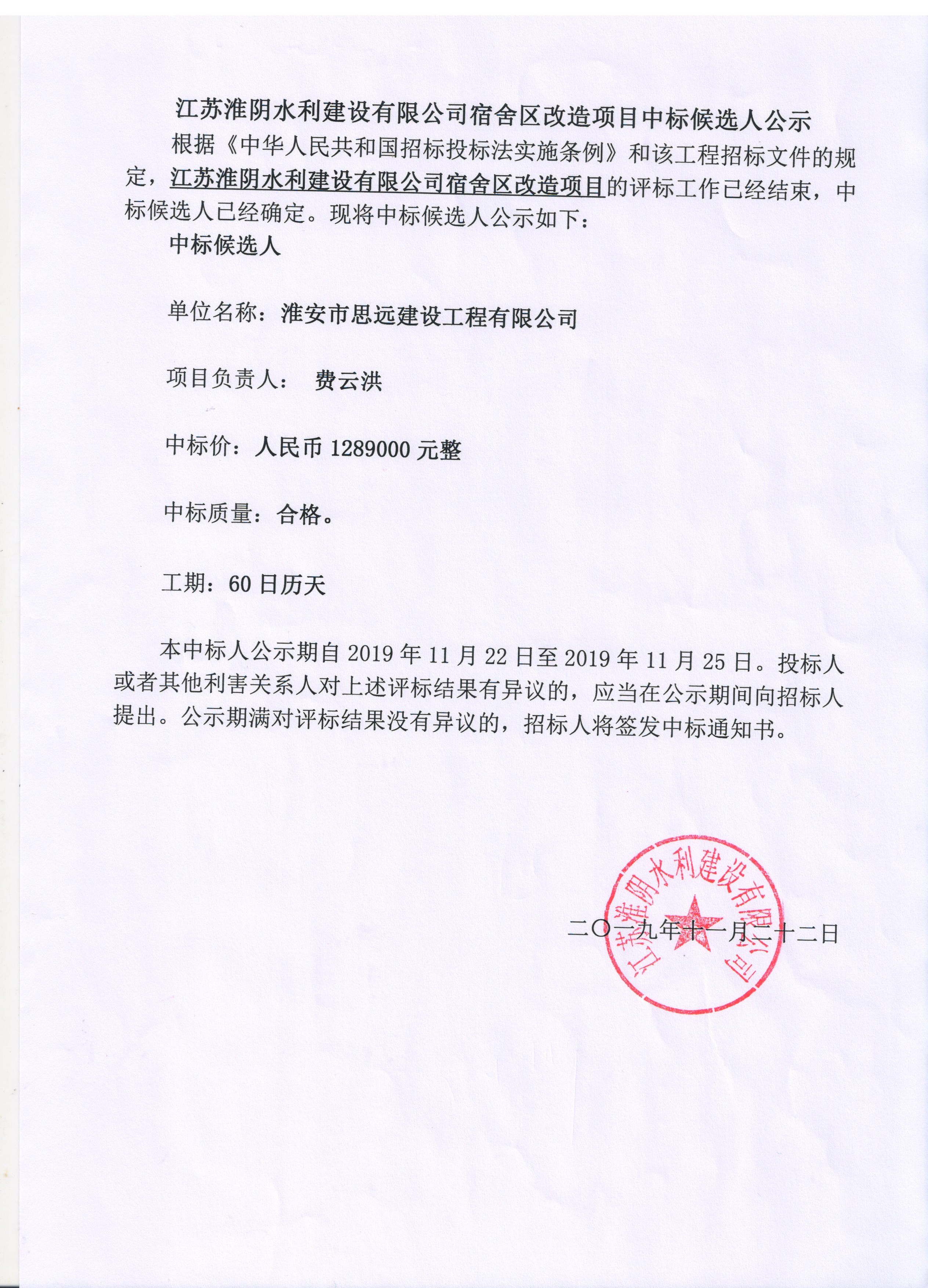 江蘇淮陰水利建設(shè)有限公司宿舍區(qū)改造項(xiàng)目中標(biāo)候選人公示